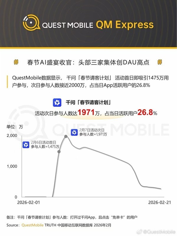 CNMO注意到,据QuestMobile数据,千问的“春节请客计划”活动成效显著,活动首日即吸引1475万用户参与,次日参与人数接近2000万,占当日App活跃用户的26.8%。据悉,千问则凭借“30亿请客计划”深度绑定了阿里生态的消费场景。2月23日千问发布的数据显示,春节期间用户在千问上“一句话下单”近2亿次。