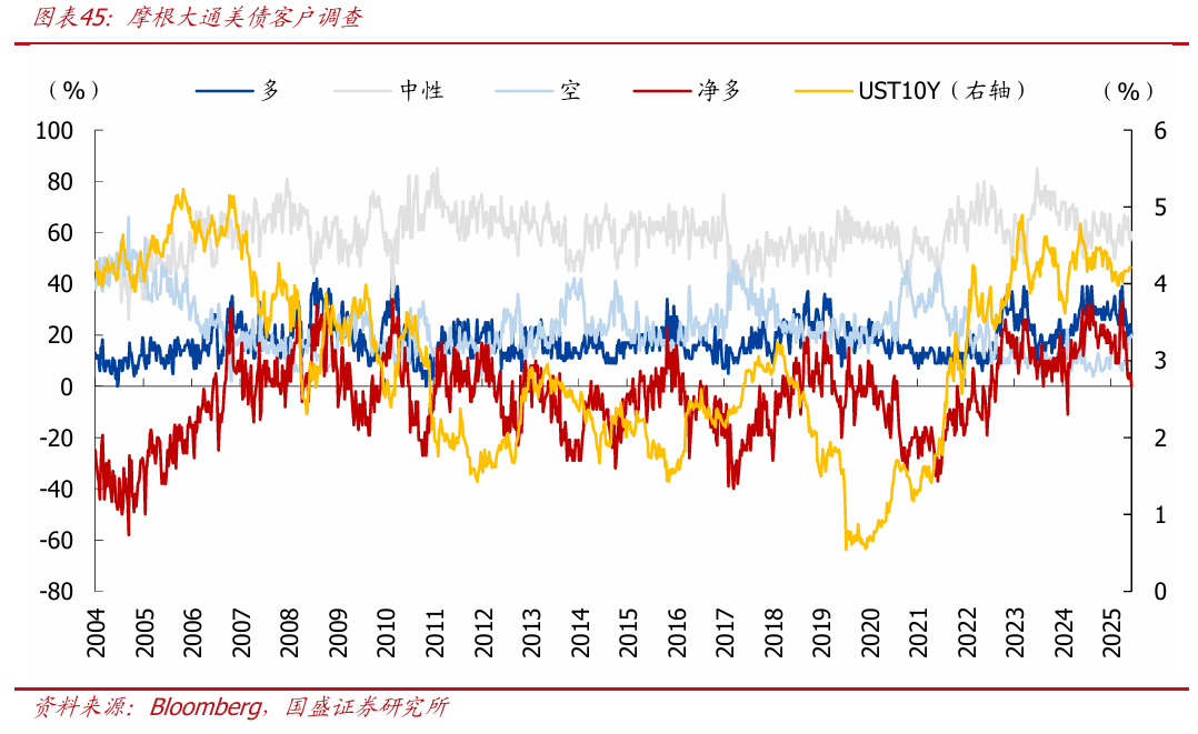 除拍卖与期货数据外,摩根大通发布的美债客户调查为观察边际需求提供了有益补充。摩根大通美债客户调查(J.P. Morgan Treasury Client Survey)为一项高频的机构投资者仓位调查,每周第一个交易日开展。调查对象需回答其当前相对于自身基准的久期立场(做多/中性/做空),若无明确基准,则直接申报绝对久期方向。整体样本通常覆盖约40-60家机构客户,其中约60%为真实资金账户(real money),25%为投机性账户(spec accounts),其余约15%为央行及主权财富基金。该指标反映的是机构投资者在美债上的边际配置意愿与交易倾向相较 CFTC 非商业期货持仓,该指标更贴近现券层面的真实需求,但受样本覆盖和期限维度限制,其本质仍偏向短期情绪与交易性需求,同样仅适合作为短期美债需求的辅助研判指标,用于刻画实际风险溢价的短期波动。
