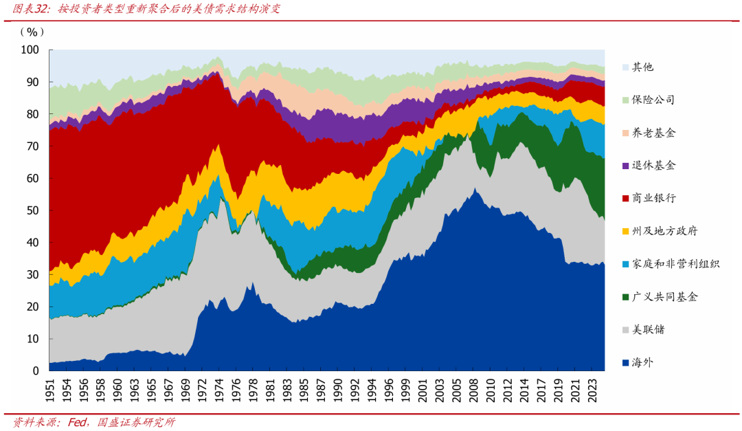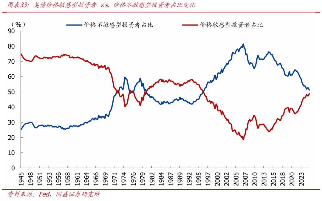 为进一步增强分析的解释力,可对 L.210 表中的细分部门进行再聚合,将配置逻辑相近或监管约束相似的投资者合并为若干大类。例如,我们将其分为海外、美联储、广义共同基金、家庭和非营利组织、州及地方政府、商业银行、退休基金、养老基金、保险公司、其他共10大类。在这一框架下,美债需求结构的长周期变化可以被理解为不同类型投资者之间的再平衡过程。此外,还可以将所有类型的投资者划分为价格敏感型(如共同基金、对冲基金等)和价格不敏感型投资者(如美联储、保险、养老和海外官方机构),两类投资者的行为差异往往决定了美债收益率对供需变化的敏感度,这同样是实际风险溢价波动的重要微观基础。