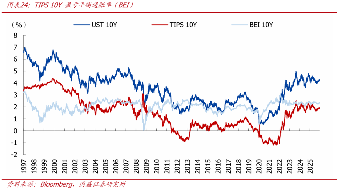 自然利率与调查类通胀预期适于把握长期趋势,但难以捕捉短期高频变动。在实际应用中,市场常采用通胀保值债券(TIPS)的收益率作为实际利率的代理变量,而同期名义国债收益率与TIPS收益率之差即为盈亏平衡通胀率(BEI)或通胀补偿(IC),可作为市场通胀预期的代理。通胀挂钩掉期(ILS)是观察市场通胀预期的另一工具。