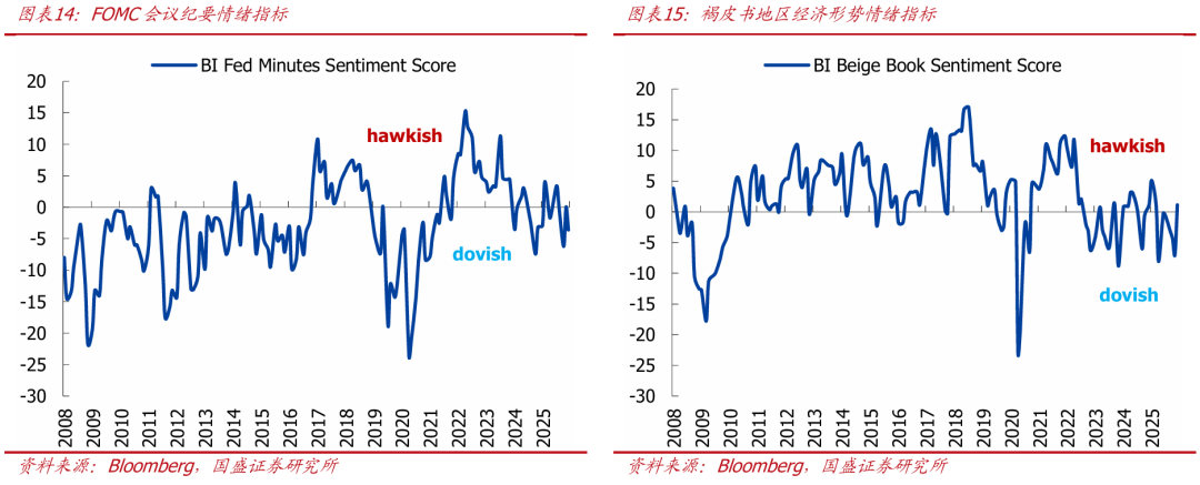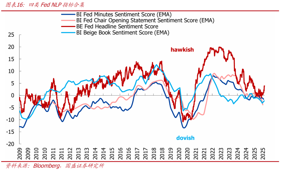 具体关注指标包括:联邦基金利率期货模型(FF Model)、泰勒规则(Taylor rule)、 Bloomberg基于NLP方法构建的联储情绪指标、基于中性利率(R*)与政策利率之间的偏离程度刻画美联储政策立场、美国经济意外指数、美国经济衰退指标等。