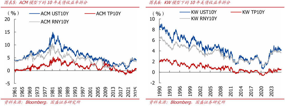 2)传统框架二:风险中性利率RNY+期限溢价TP。从市场交易与期限结构视角,长期利率可分解为未来短期利率预期路径与持有长期债券所要求的额外风险补偿,即期限溢价。与自然利率类似,期限溢价无法直接观测。其估计需依赖期限结构模型(ATSM),如ACM模型、KW模型、HT模型等,这些模型构成了理解美债收益率的另一重要范式。