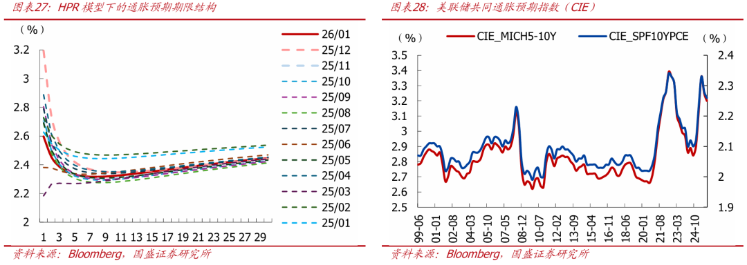 1)克利夫兰联储的通胀预期模型(HPR Model),可以生成通胀预期的期限结构。该模型以通胀互换数据以及名义收益率和通胀调查预测数据等为基础,通过构建期限结构模型对预期通胀、实际利率及风险溢价进行联合估计,可生成包括不同期限通胀预期在内的完整预测序列,我们可以借助其观察通胀预期的期限结构(1-30年)。
