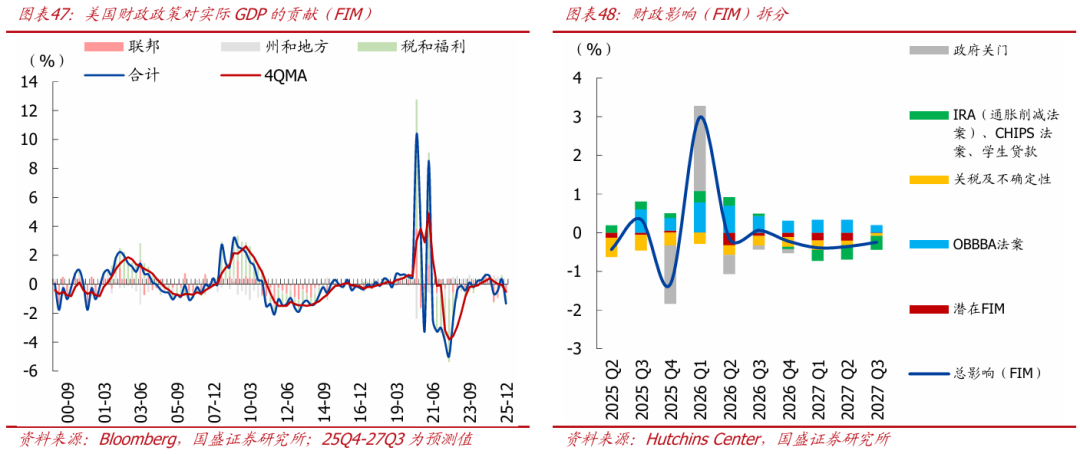 2)中期看,重点关注财政脉冲对总需求的影响,主要采用哈钦斯研究中心(Hutchins Center)的财政影响测度(Fiscal Impact Measure,FIM)指标来衡量财政政策对实际经济增长的净拉动。