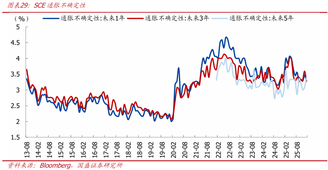 纽约联储SCE调查提供的通胀不确定性(Inflation Uncertainty)指标能够直接反映家庭部门对通胀分布的主观认知,是当前较为干净的参考变量。尽管其频率偏低,但其在一定程度上适用于刻画通胀锚定状态及通胀风险溢价的中长期变化,而非短期的交易信号。