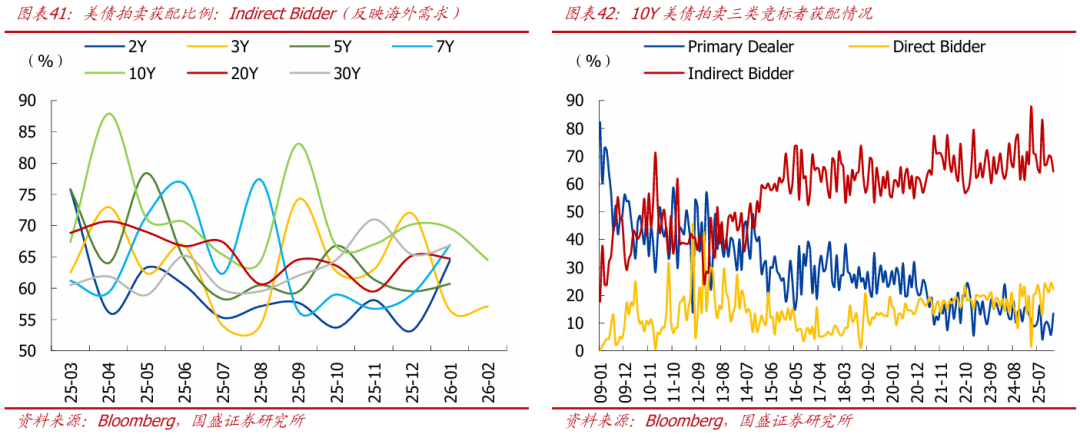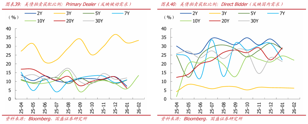 3)拍卖结果还可通过不同竞标者的获配比例,拆分需求来源结构,主要包括三类主体。一级交易商(Primary Dealers)的参与具有一定义务性和被动性,获配比例偏高通常意味着市场主动需求不足;直接竞标者(Direct Bidders)主要反映美国国内机构和投资者的实际配置需求;间接竞标者(Indirect Bidders)以外国央行及国际货币当局为主,可作为海外官方部门需求的近似指标。