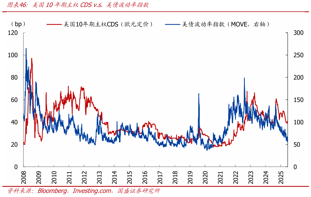 1)短期看,我们通过主权CDS的价格变化来跟踪市场对财政与政治风险的阶段性定价。以美国10年期主权CDS为例,其本质反映的是市场对美国主权信用违约风险的“保险成本”,虽不等同于真实违约概率,但其对财政博弈、信用评级调整、政府停摆风险、债务上限争议等事件较为敏感。CDS利差上升意味着投资者要求更高的补偿以对冲潜在违约风险,利差下降则表明信用风险预期有所缓和。