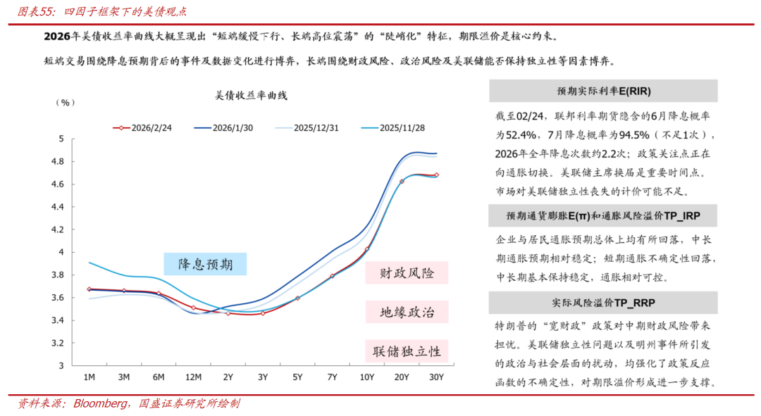 1)四因子综合来看,基准情形下,2026年美债收益率曲线大概率呈现出“短端缓慢下行、长端高位震荡”的“陡峭化”特征,期限溢价是核心约束,短端交易围绕降息预期背后的事件及数据变化进行博弈,长端围绕财政风险、政治风险及美联储能否保持独立性等因素博弈。