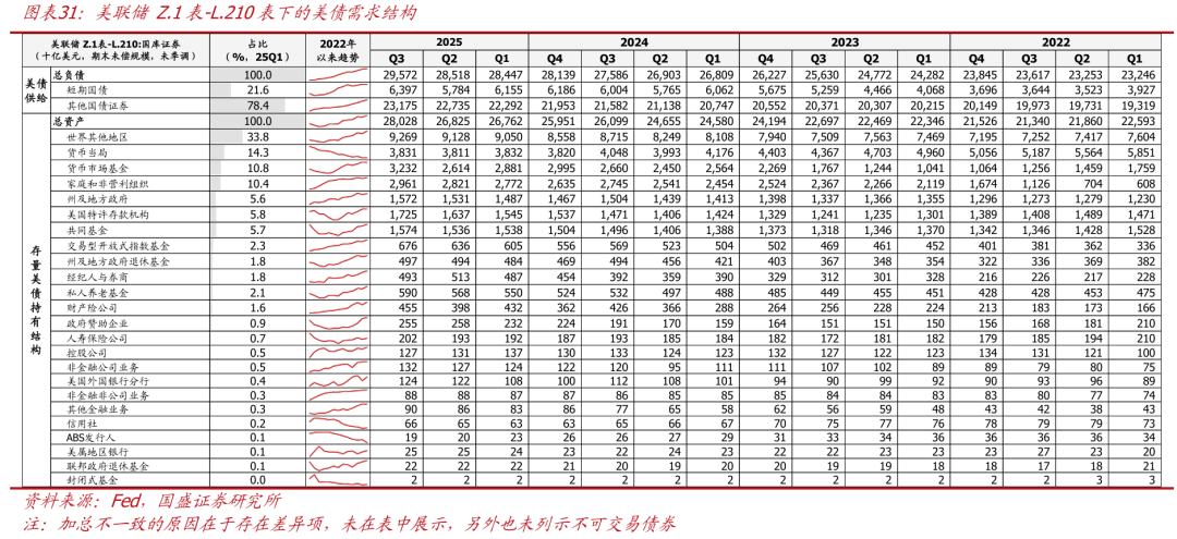 我们以美联储季度发布的Z.1表中的 L.210 表作为核心,对公众所持有的可流通美债进行拆解。该表一方面从政府作为债务方的角度刻画公众持有的美债规模,另一方面从投资者作为资产持有者的角度反映美债在不同部门之间的配置结构,从而为分析长期需求基础提供了统一、稳定的统计框架。