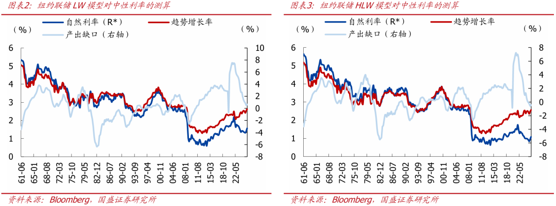 从长期来看,宏观利率水平应与自然利率相匹配。在新凯恩斯框架下,自然利率的内涵接近于“均衡实际利率”或“中性实际利率”,可简记为R*(R-star)。直观上,自然利率可视作实际利率的长期趋势中枢,实际利率围绕其波动。自然利率的估算方法多样,其中由纽约联储发布的LW模型及后续的HLW模型是市场主流参考。Laubach & Williams(2003)率先提出半结构化估计模型,Holston等人(2023)后续对其进行了调整。