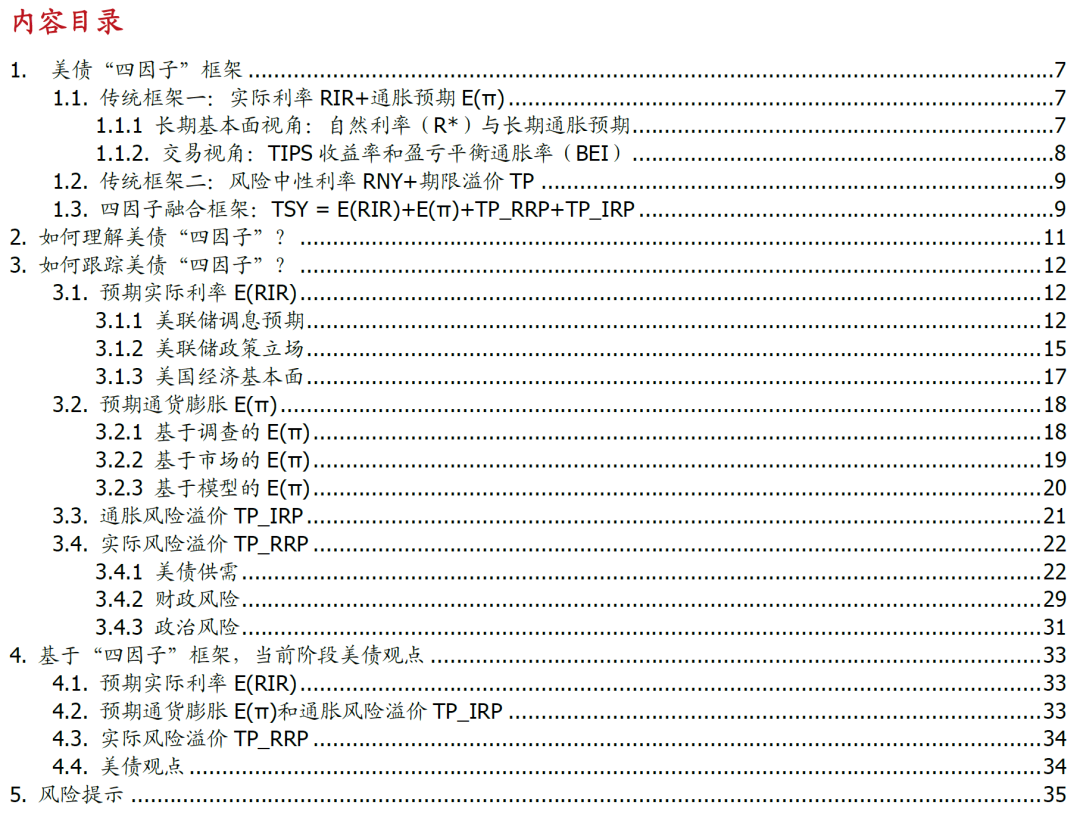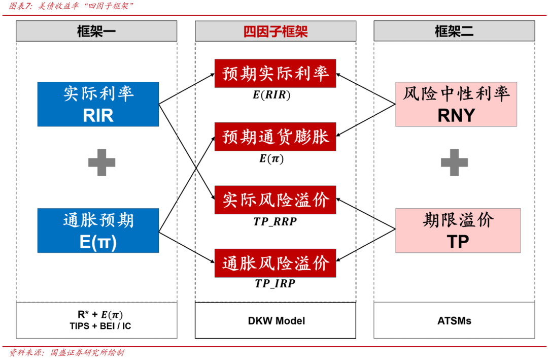 3)四因子融合框架:TSY = E(RIR)+E(π)+TP_RRP+TP_IRP。可参考伯南克(Ben Shalom Bernanke)与克拉里达(Richard Clarida)的论述,将两个传统框架进行融合。基于这一框架,名义美债收益率取决于预期实际利率、通胀预期、实际风险溢价、通胀风险溢价四项,这是一个解释性强、且可反复用于“事后归因+事前判断”的分析框架。
