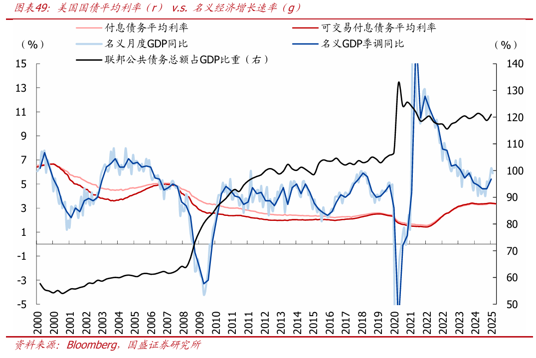 3)长期看,可以从政府债务可持续性的角度出发,评估财政路径在“利率-增长”(r-g)约束下的可行性,我们主要跟踪美债平均利率(r)与名义经济增速(g)间的相对关系。财政风险的核心在于债务是否具备内生稳定机制,其关键在于债务利率(r)与经济增速(g)之间的相对关系。在r< span><>