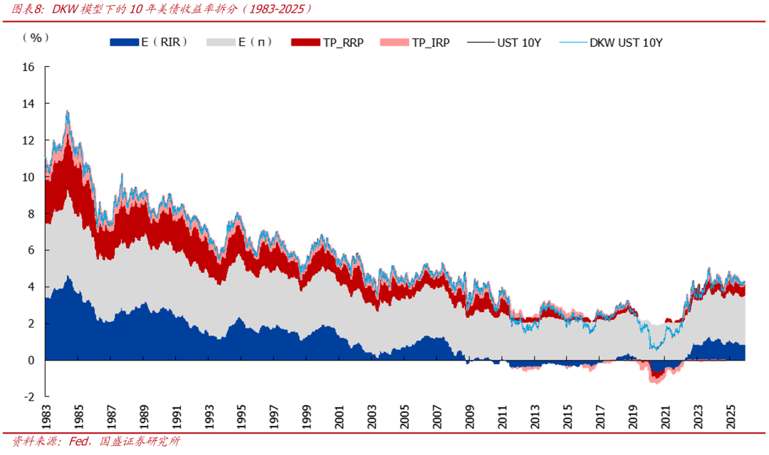 一是由资产配置或美债供需格局决定的中期趋势,反映在不同经济与政策环境下,全球资金对美债的配置偏好变化;二是由利率波动和不确定性带来的风险补偿,对应宏观、政策与金融条件不确定性上升时,对实际利率所要求的额外溢价。