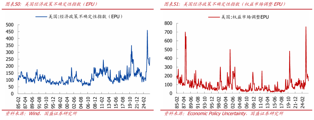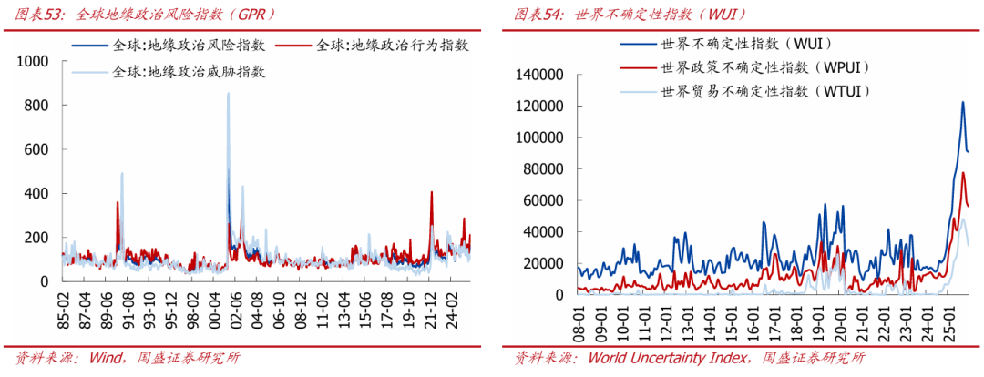 基于这一思路,政治风险可从美国内政、全球地缘政治、全球总体不确定性三个层面进行跟踪,指标上分别对应经济政策不确定性指数(EPU)、地缘政治风险指数(GPR)、世界不确定性指数(WUI)。EPU 主要捕捉国内政策层面的不确定性与制度摩擦;GPR聚焦于全球政治风险事件的演进;WUI则综合反映全球经济与政策语境中的不确定性。鉴于日度数据波动较大,对于三类指标我们均关注其月度数据。