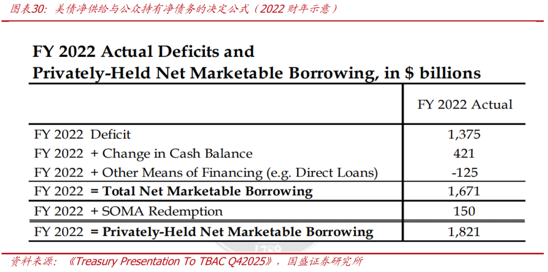1)美债净供给(Total Net Marketable Borrowing)=财政赤字(Defict)+TGA账户变动(Change in Cash Balance)+其他融资需求(Other Means of Financing);