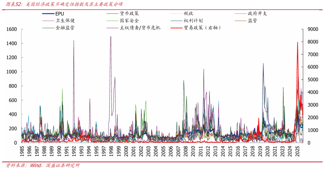1)美国内政:美国经济政策不确定性指数(Economic Policy Uncertainty Index, EPU)是一种综合衡量政策相关不确定性的指标,由Baker、Bloom、Davis构建并持续更新。EPU 及其分项(包括货币政策、税收、政府开支、卫生保健、国家安全、权利计划、监管、金融监管等)用于衡量美国政策环境的不确定性变化。在财政博弈、政策转向或政治分裂加剧阶段,总体EPU往往明显上行,并与美债收益率、期限溢价的阶段性波动相伴。考虑到政策议题之间高度交织,单一分项的解释力有限,实际跟踪中更适合关注总体EPU的趋势性变化。