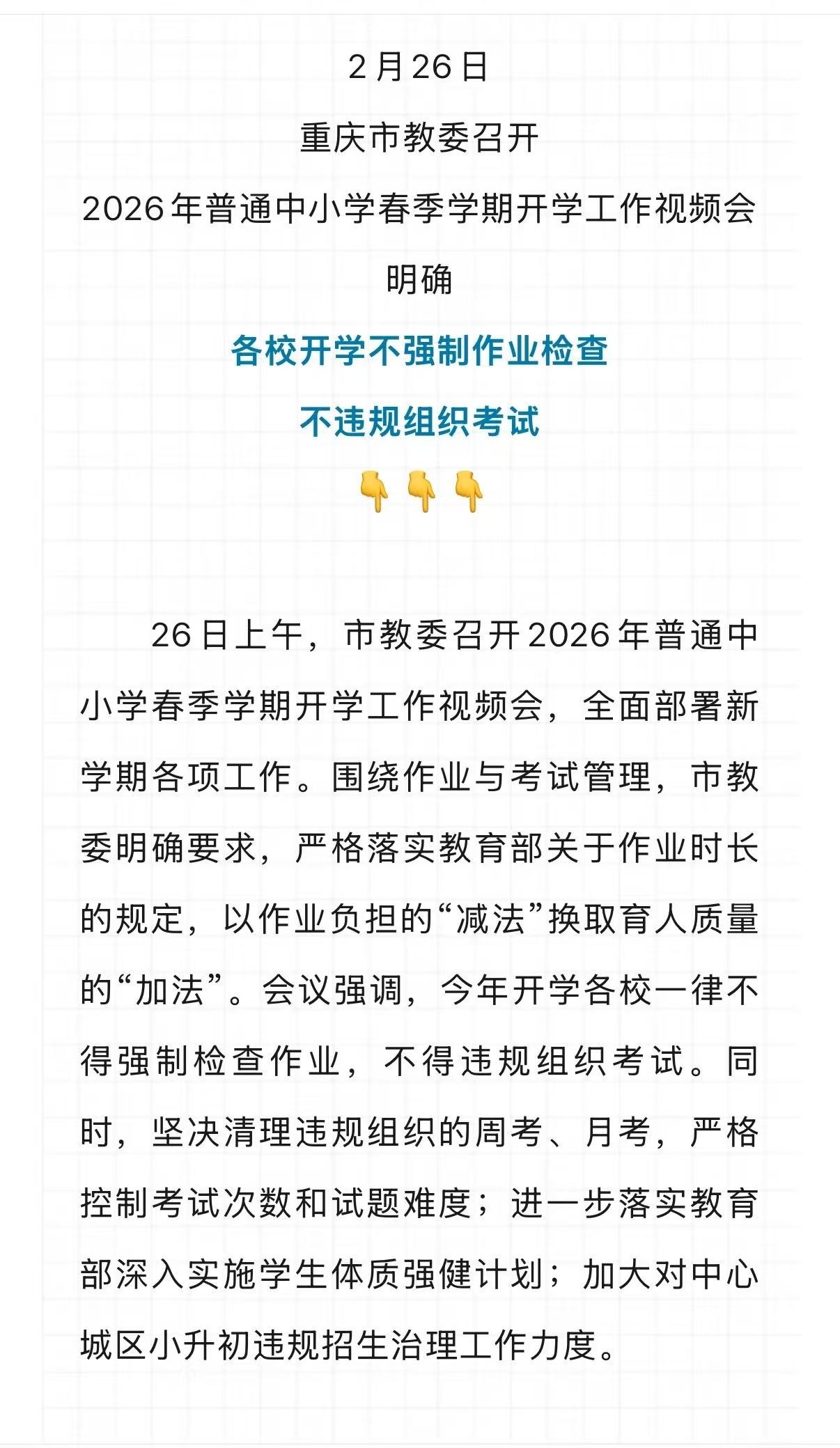 据重庆发布,2月26日,重庆市教委召开2026年普通中小学春季学期开学工作视频会,明确各校开学不强制作业检查,不违规组织考试。