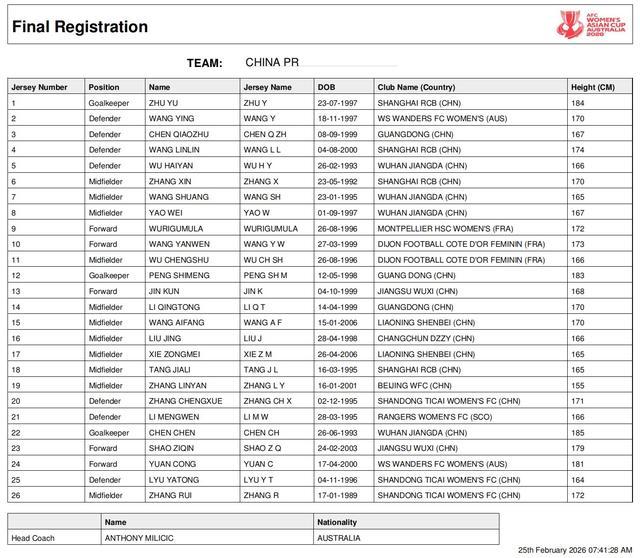 今日,亚足联正式公布了中国女足参加2026年女足亚洲杯的球员名单。根据官方名单,本次女足球衣号码分配中,王霜身披7号,王妍雯10号,张琳艳19号,队长吴海燕5号。