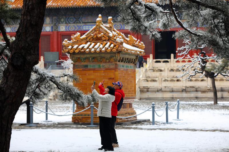 漫步陵区,空气中弥漫着雪后清新的气息,昔日庄严肃穆的皇家园陵,因这场春雪更添几分诗意与灵动。不少游客和摄影爱好者特意踏雪而来,举着相机、手机穿梭在红墙白雪之间,定格古建琼枝、飞檐落雪的绝美画面,在移步换景中感受大明王朝的鼎盛气象与雪景的静谧意境。快门声与游客的轻声赞叹交织,为肃穆的陵寝增添了十足的生机与活力,也让历史古建在白雪的映衬下,焕发出新的魅力。