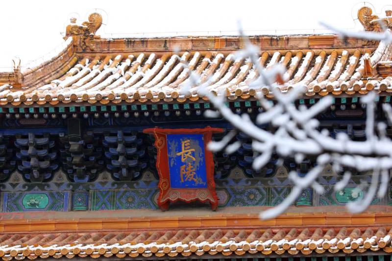 雪后初霁,长陵景区内处处皆是景致。飞檐翘角落满白雪,檐角的琉璃瑞兽身披银装,在晨光中更显灵动肃穆;红墙朱门与皑皑白雪形成鲜明对比,黄色琉璃瓦在积雪覆盖下若隐若现,与远山含黛的景致相映成趣,色彩层次分明,静谧中透着历史的厚重与温润。