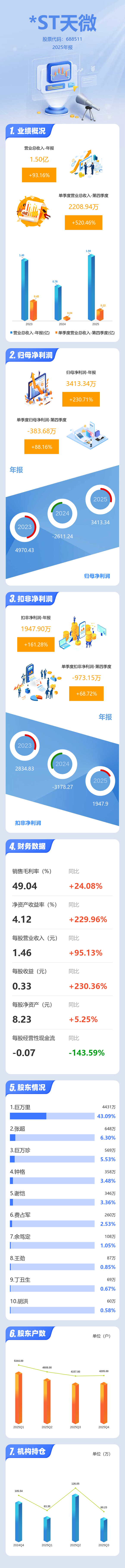证券之星消息,*ST天微2025年年报显示,当年度公司主营收入1.5亿元,同比上升93.16%;归母净利润3413.34万元,同比上升230.72%;扣非净利润1947.9万元,同比上升161.29%;其中2025年第四季度,公司单季度主营收入2208.94万元,同比上升520.46%;单季度归母净利润-383.68万元,同比上升88.16%;单季度扣非净利润-973.15万元,同比上升68.72%;负债率11.68%,投资收益694.77万元,财务费用-129.98万元,毛利率49.04%。