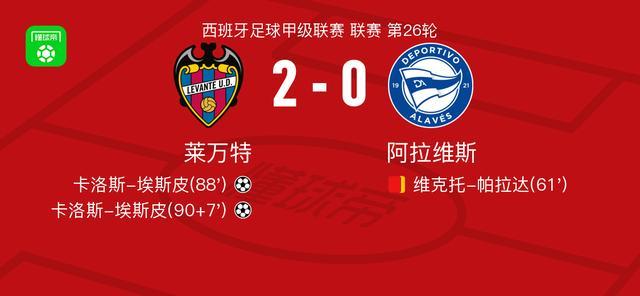 北京时间2月28日西班牙足球甲级联赛 联赛 第26轮,莱万特主场对阵阿拉维斯。莱万特卡洛斯-埃斯皮梅开二度。最终比分莱万特 2-0 阿拉维斯。