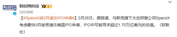 【CNMO科技消息】据“财联社”消息,SpaceX正考虑最快于2026年3月向美国证券交易委员会(SEC)秘密递交IPO申请,若进展顺利,有望于6月正式挂牌上市。此次IPO目标估值或突破1.75万亿美元,融资规模预计达300亿至500亿美元,将远超沙特阿美2019年290亿美元的募资纪录,成为全球史上最大规模IPO,同时跻身全球市值前七,仅次于苹果、微软等科技巨头。
