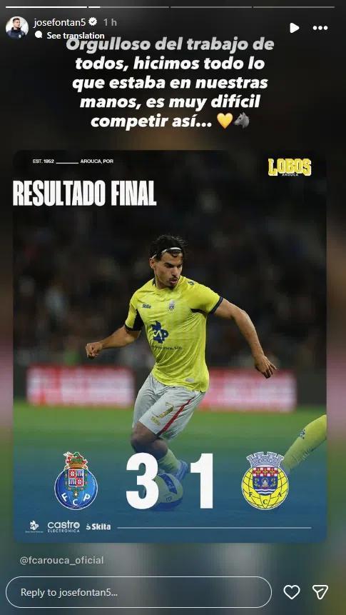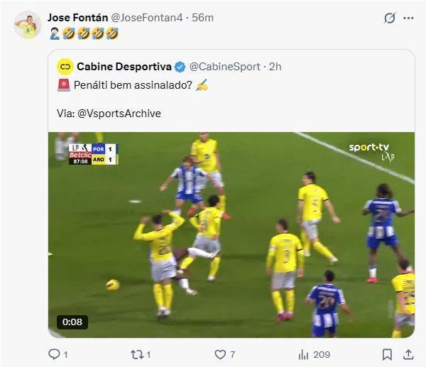 葡超第24轮,波尔图主场3-1击败阿罗卡。在比赛尾声波尔图获得点球并将比分改写成2-1,这个点球判罚引发了阿罗卡队长何塞-丰坦的强烈不满。何塞-丰坦 ,在社交媒体上连发两条动态表态。