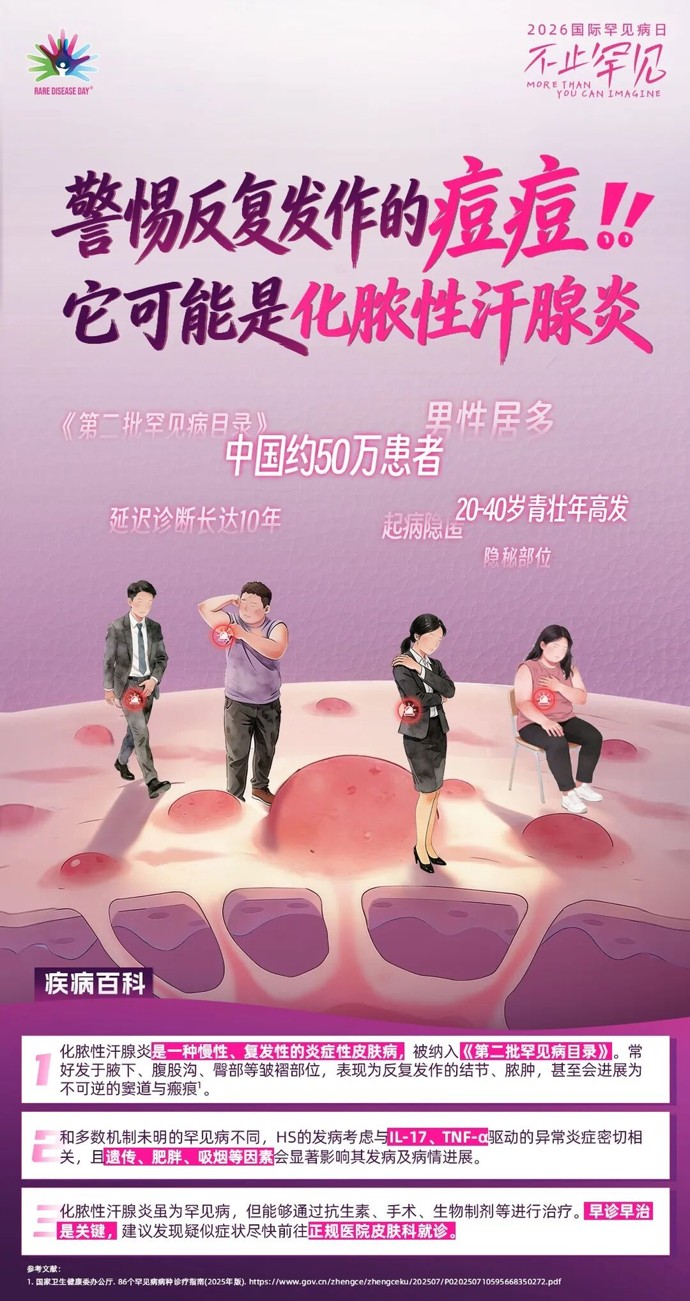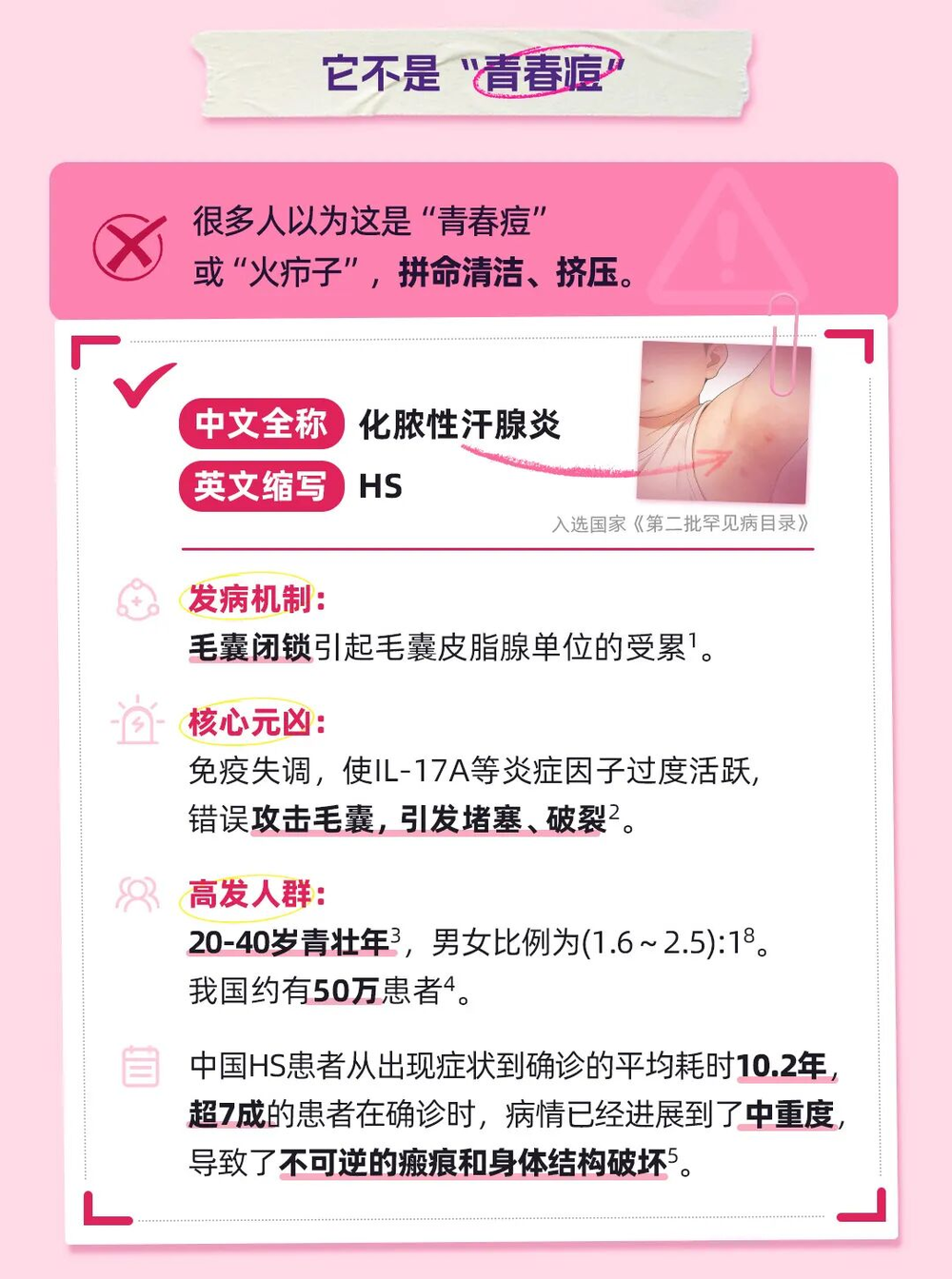 在我国,50多万患者正承受着这份难以言说的痛苦2。他们多为青年男性,大多在青春期后、学习工作的上升期发病,却因疾病隐匿、诊断困难,在疼痛、流脓、瘢痕中苦苦挣扎3-5。