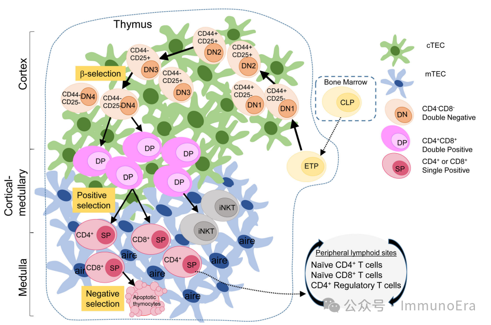 从皮质结,骨髓衍生淋巴祖细胞首先接受cTECs提供Notch配体(DLL4)和IL-7,成为早期胸腺前体(ETP),也指定为“双阴性”胸腺细胞(缺乏表达CD4和CD8)。