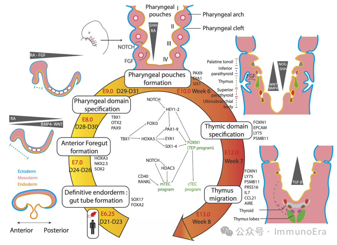 这些分子都参与了驱动胸腺原基的发育,而HOXA3和EYA1,也在神经嵴来源的间充质细胞发育中发挥作用。