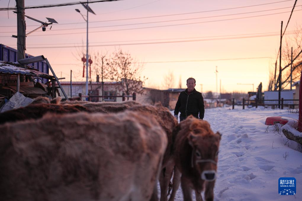2月9日,在伊犁哈萨克自治州新源县,木沙江·海拉特在放牛。