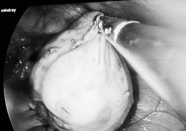 4.微创根治手术:待患者感染控制、病情稍稳后,由妇产科与麻醉科团队精准评估时机,成功施行“单孔腹腔镜卵巢畸胎瘤切除术”,以最小创伤祛除了病因,术中出血仅20ml。