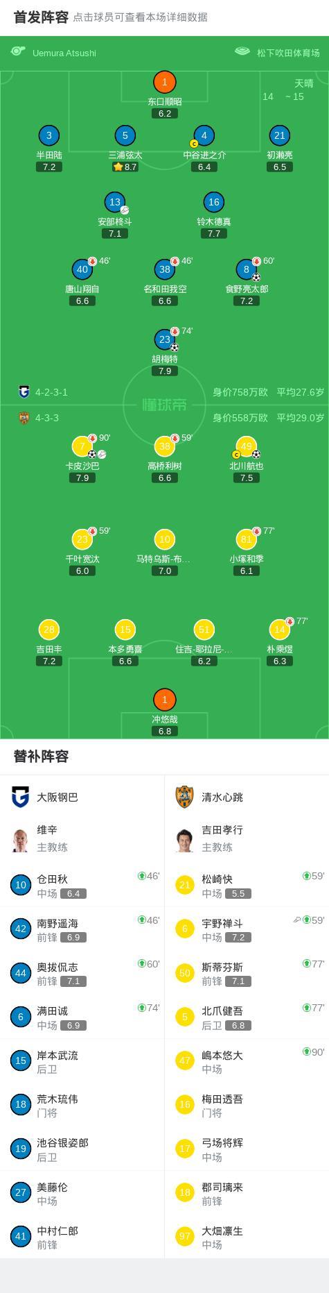 北京时间2月28日日本职业联赛J1 西区 第4轮,大阪钢巴主场对阵清水心跳。大阪钢巴食野亮太郎破门,胡梅特破门。清水心跳北川航也破门,卡皮沙巴破门。最终比分大阪钢巴 7-6 清水心跳。