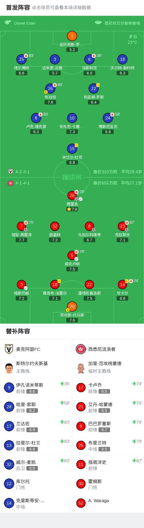第24分钟,麦克阿瑟FC接应球员被主裁判阻挡,克拉耶夫反击破门,西悉尼流浪者2-0!