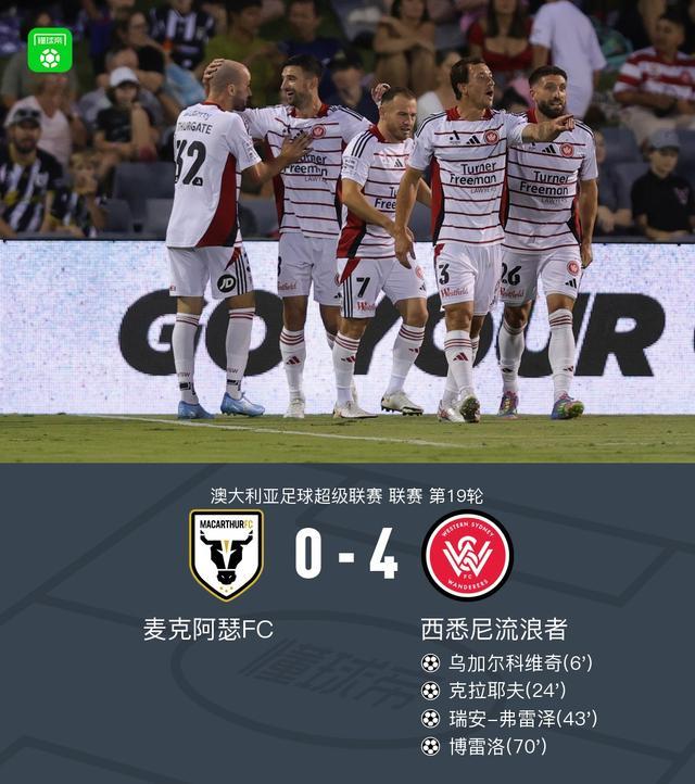 北京时间2月28日,澳大利亚足球超级联赛第19轮,麦克阿瑟FC主场对阵西悉尼流浪者。比赛中,乌加尔科维奇闪击,克拉耶夫建功,瑞安-弗雷泽抓住麦克阿瑟FC门将低级失误吊射破门,希克卢纳一条龙助攻博雷洛锦上添花。最终,西悉尼流浪者4-0大胜麦克阿瑟FC。