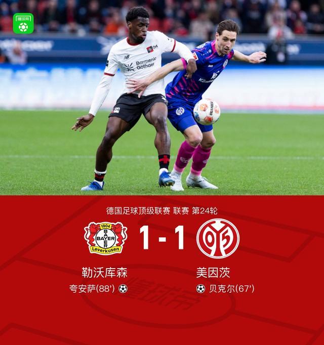第88分钟,夸安萨推射破门,勒沃库森扳平比分,1-1