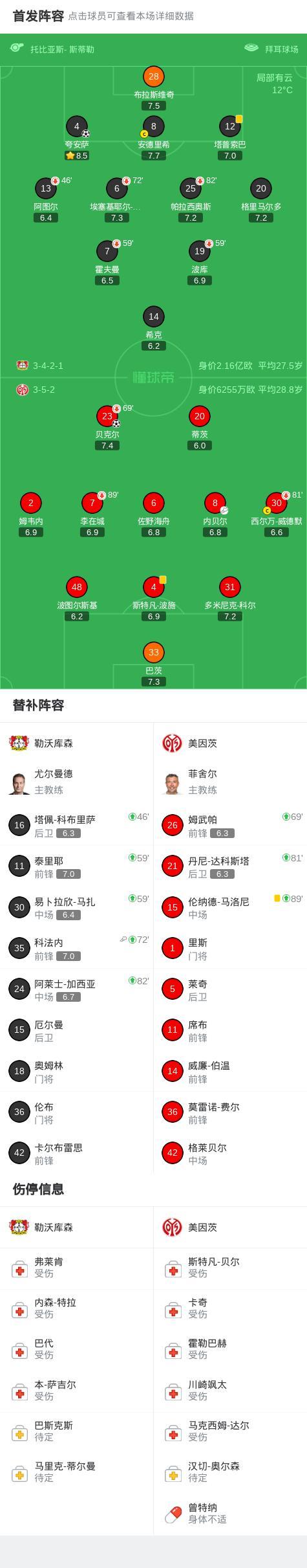 第67分钟,贝克尔凌空扫射破门,美因茨客场1-0勒沃库森
