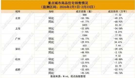 观点指数重点监测北京、上海、广州、深圳、杭州、成都6个重点城市商品住宅及二手住宅市场,其中成交数据显示,2026年2月前三周,受春节假期季节性扰动,6城新房市场成交量较1月环比回落,监测周期内商品住宅合计成交9627套,成交总面积113.25万平方米;截至2月前三周,2026年年内6城商品住宅累计成交面积达367.74万平方米。