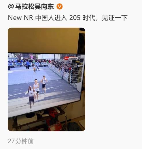 随后,全运会男子马拉松季军吴向东更新社媒,写道:New NR 中国人进入 205 时代,见证一下!