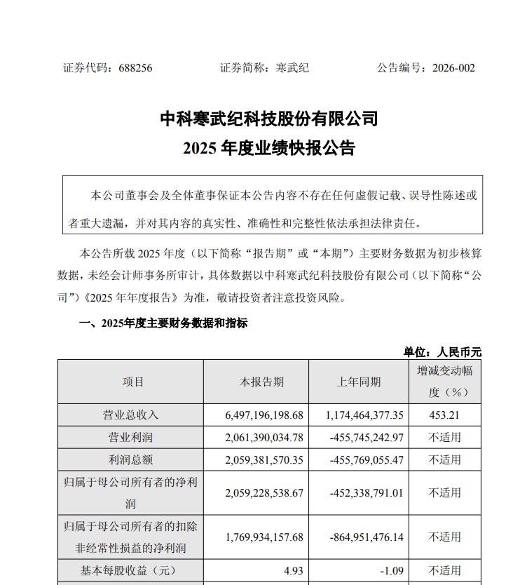2月27日,国产AI芯片企业寒武纪发布2025年度业绩快报。公司全年营收64.97亿元,同比激增453%,实现归母净利润达20.59亿元,同比扭亏,而去年同期还亏损4.52亿元。这是寒武纪自2020年上市以来,首次实现年度整体盈利。而摩尔线程、沐曦股份等芯片股虽然未能扭亏,但减亏幅度较大。