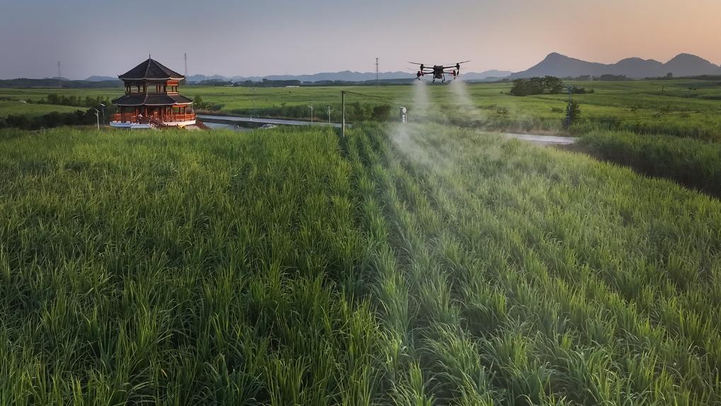 植保无人机在来宾市国家现代农业产业园黄安优质“双高”糖料蔗基地进行飞防作业(2025年7月摄)。(受访单位供图)