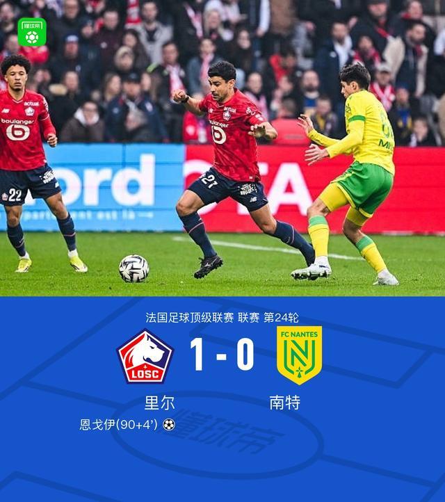北京时间3月2日法国足球甲级联赛第24轮,里尔主场迎战南特。下半场补时阶段默尼耶将球回做,恩戈伊破门。最终里尔1-0战胜南特。