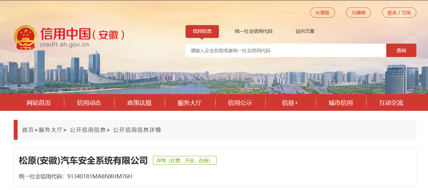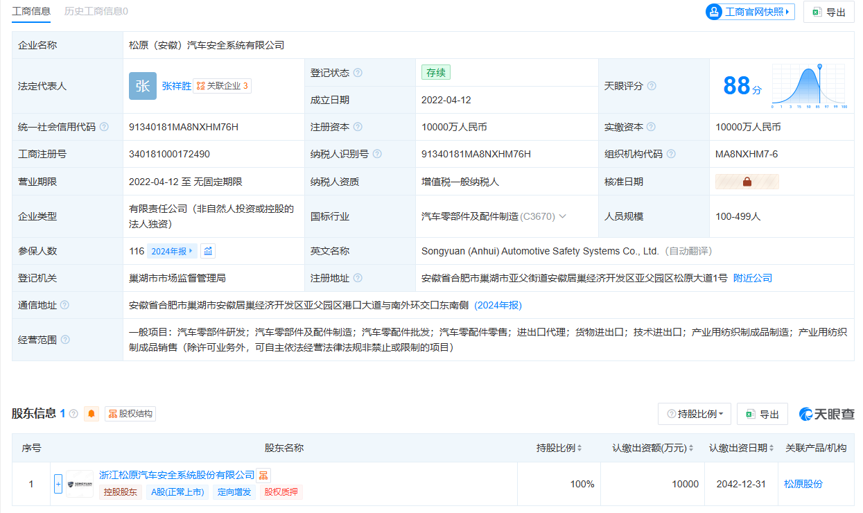 天眼查信息显示,松原 (安徽) 汽车安全系统有限公司,成立于2022年,松原安全成员,位于安徽省合肥市,是一家以从事汽车制造业为主的企业,由上市公司浙江松原汽车安全系统股份有限公司全资控股。风险方面发现企业有涉诉关系1条,开庭公告2条。