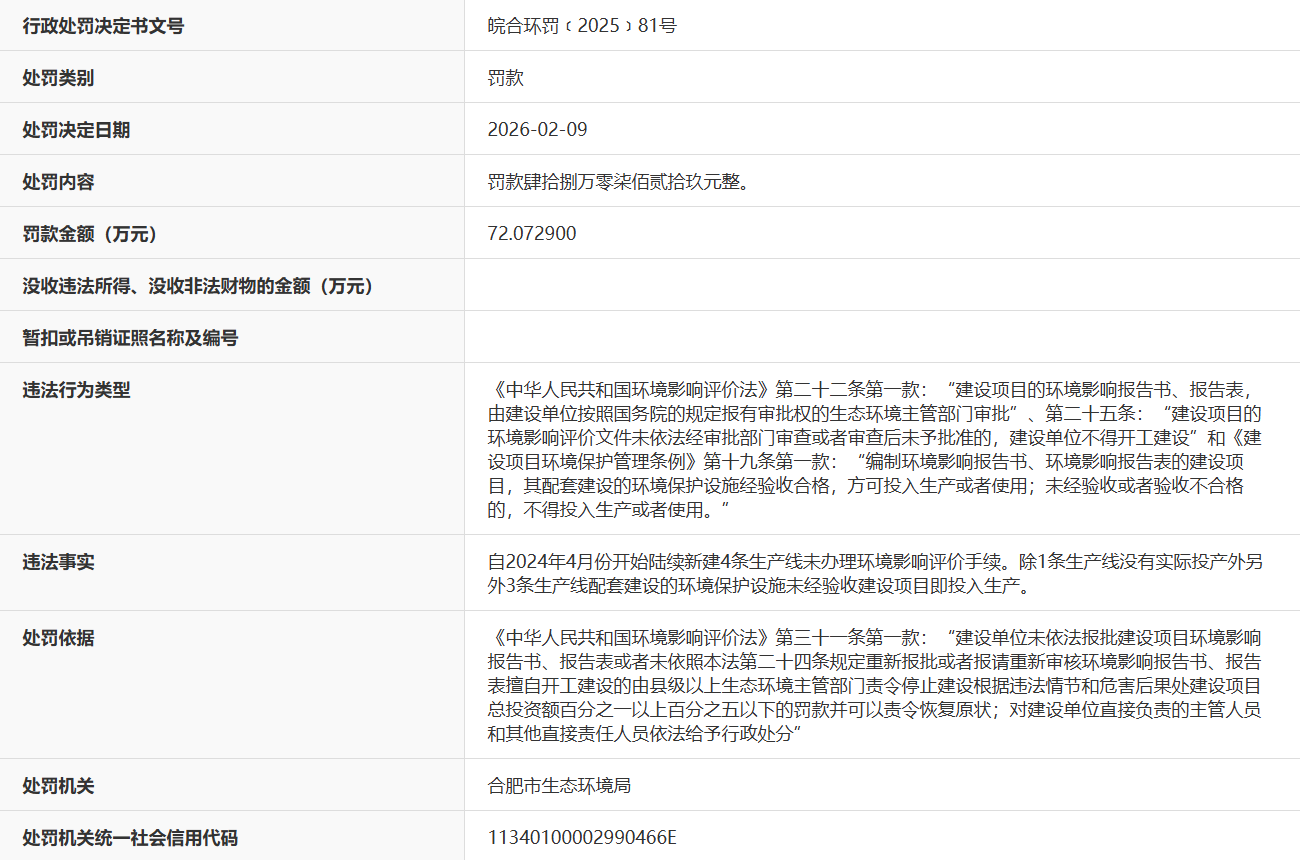 近日,据“信用安徽”公开披露行政处罚信息,因项目未办环评以及配套环保设施未经验收即投产,松原(安徽)汽车安全系统有限公司被处以罚款72.0729万元。行政处罚决定书文号是皖合环罚﹝2025﹞81号。