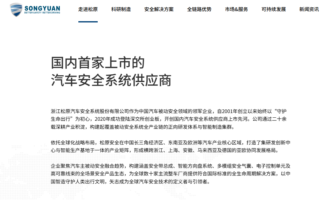 松原安全官网信息显示,浙江松原汽车安全系统股份有限公司作为中国汽车被动安全领域的领军企业,2020年成功登陆深交所创业板,开创国内汽车安全系统供应商上市先河。松原安全在中国长三角经济区、东南亚及欧洲等汽车产业核心区域,打造了集研发创新中心与智能生产基地于一体的产业矩阵,形成横跨浙江、上海、安徽、马来西亚及德国的亚欧协同发展格局。