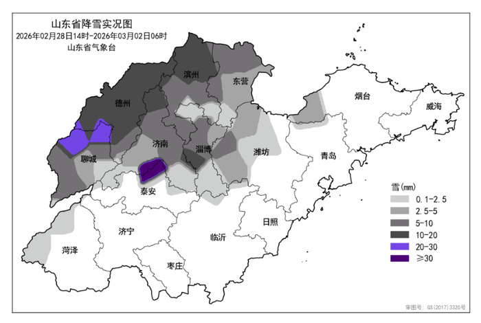 这场雨雪天气从2月28日拉开帷幕,再来关注一下过程降水情况:2月28日14时至3月2日6时,全省普遍出现降水,平均降水量21.8毫米,折合水量约34.2亿立方米。各市平均:菏泽36.1毫米、聊城35.3毫米、泰安31.9毫米、济宁29.8毫米、潍坊28.3毫米、淄博25.7毫米、济南25.3毫米、德州19.0毫米、青岛18.1毫米、日照16.8毫米、临沂16.7毫米、东营16.6毫米、滨州16.2毫米、枣庄16.1毫米、烟台6.0毫米和威海3.4毫米。降水量前3位的是:泰安泰山46.8毫米、聊城莘县43.1毫米和菏泽单县42.5毫米。