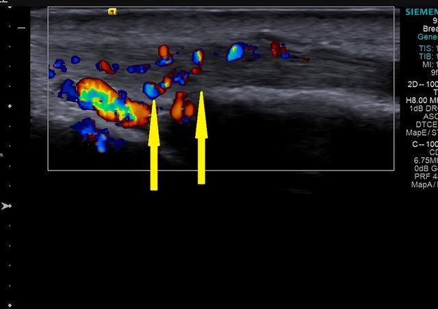 彩色多普勒超声显示:增厚的肌腱及腱鞘血流信号增多。