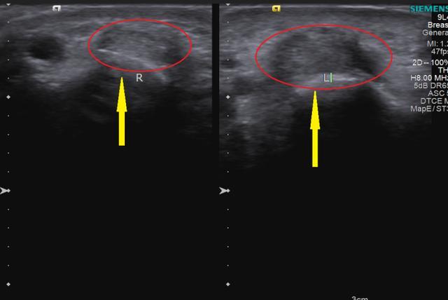 超声结果显示:左侧手腕拇长展肌腱、拇短伸肌腱腱鞘较右侧明显增厚,回声减低。