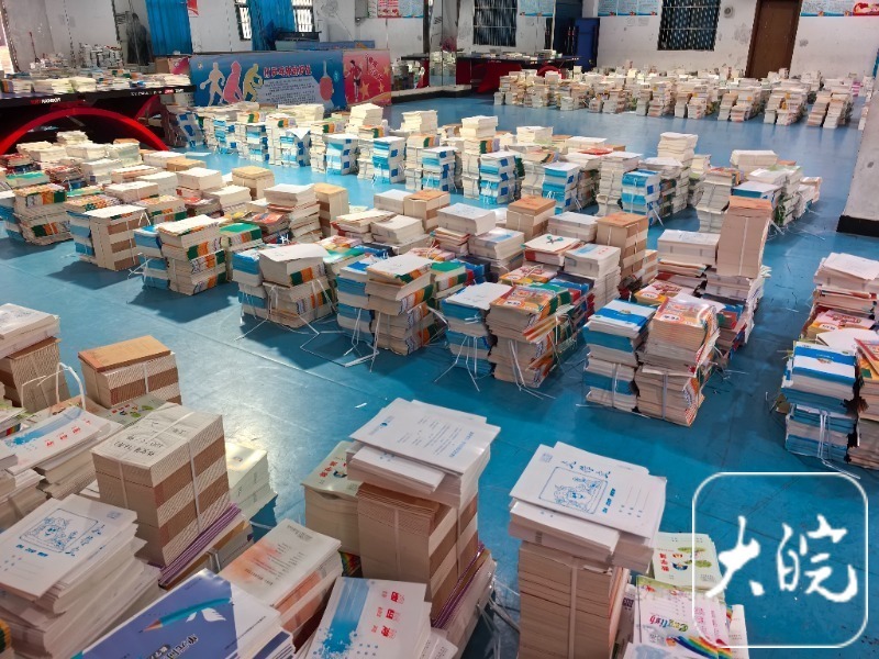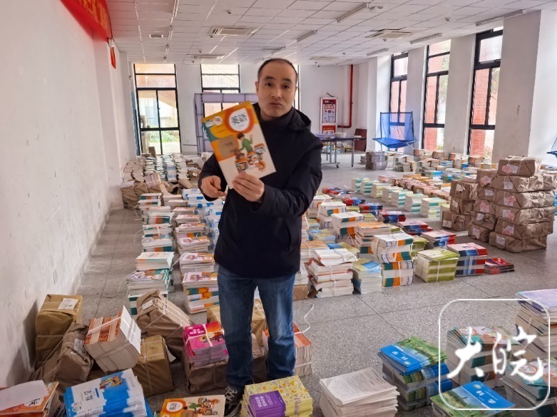 在位于六安市南华路的雷锋路小学,金志新老师带领记者走进教务处用于囤书的一个圆形大厅,按年级和班级分类,地上堆着语文、数学、英语、科学等课本,还有同步作业本,这些分类好的新书本都是老师们近两天辛苦劳动的结果。“我校南校区的新书本也整理好了,但因为下雨,目前还没运过去,暂时还在这里。”金志新老师说。